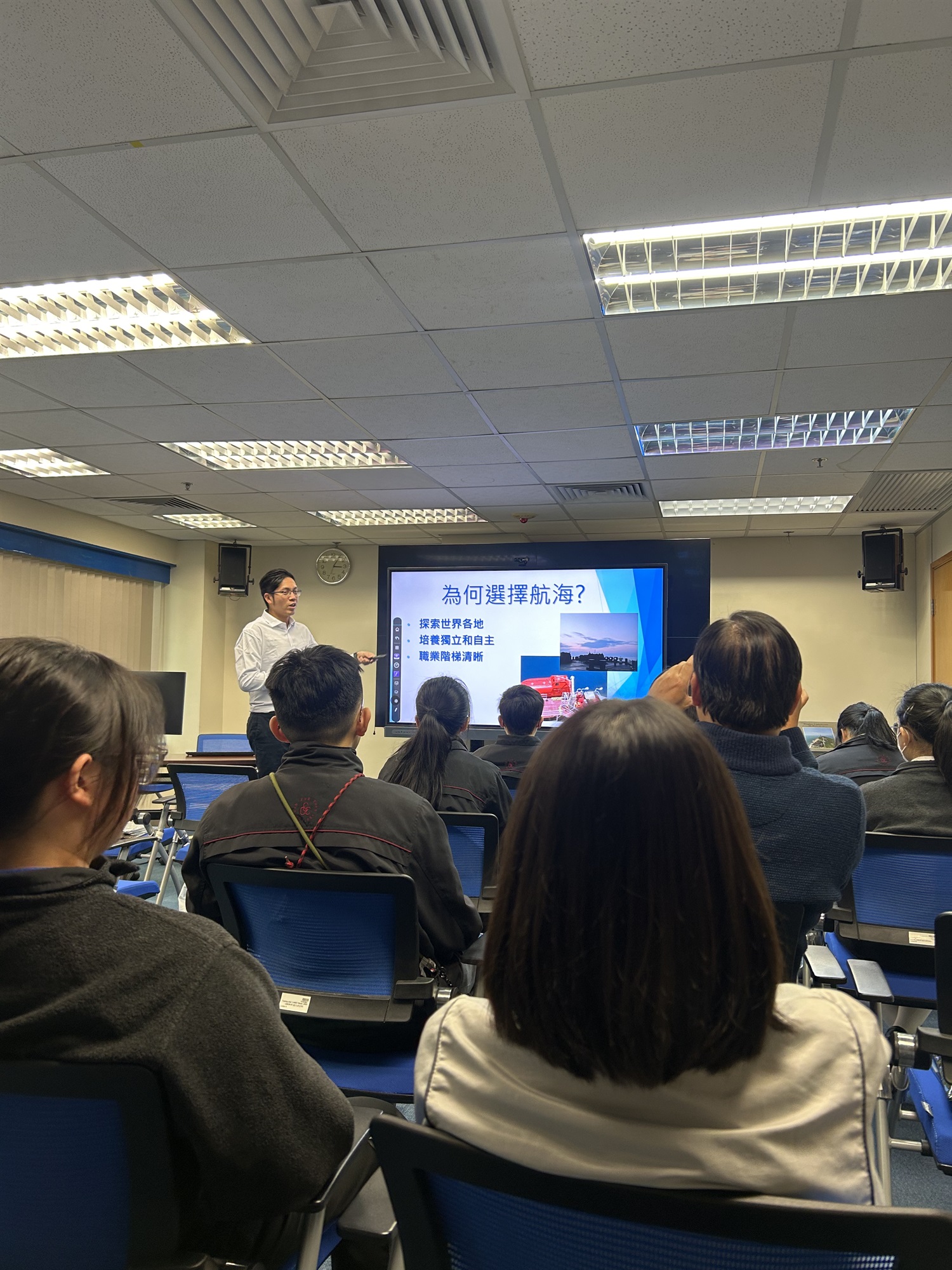 當日海事處高級海事主任 Anson化身導師,除咗介紹海事處嘅主要職能,仲講解咗海事主任、海事督察同海事監督呢幾個職系嘅就業機會同發展前景。Anson仲分享咗自己當年「行船」嘅趣聞同點滴,等我哋了解海上工作嘅挑戰同樂趣。現場氣氛既輕鬆又多互動,我哋都踴躍發問,借機會了解更多!